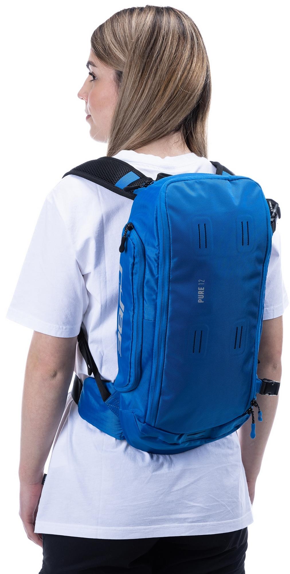 Need a backpack with room to stash everything you'll need on bike day? The pure 12 is the perfect choice! Ergonomic shoulder straps, soft hip straps and cube's own nf ergonomics back system developed in-house keep it sitting pretty for a backpack you can wear all day. We also added padding and ventilation so your back stays comfortable and fresh. The pure 12 is hydration system-compatible with a central outlet for the drinking tube. Practical highlights include a side tool compartment, a smartphone pocket and the option to attach a light. The backpack also features the versatile molle system, so it's easy to securely attach the small cube accessory bag 1 or cube accessory bag 2 using the integrated touch fasteners for practical extra storage.