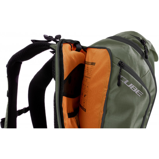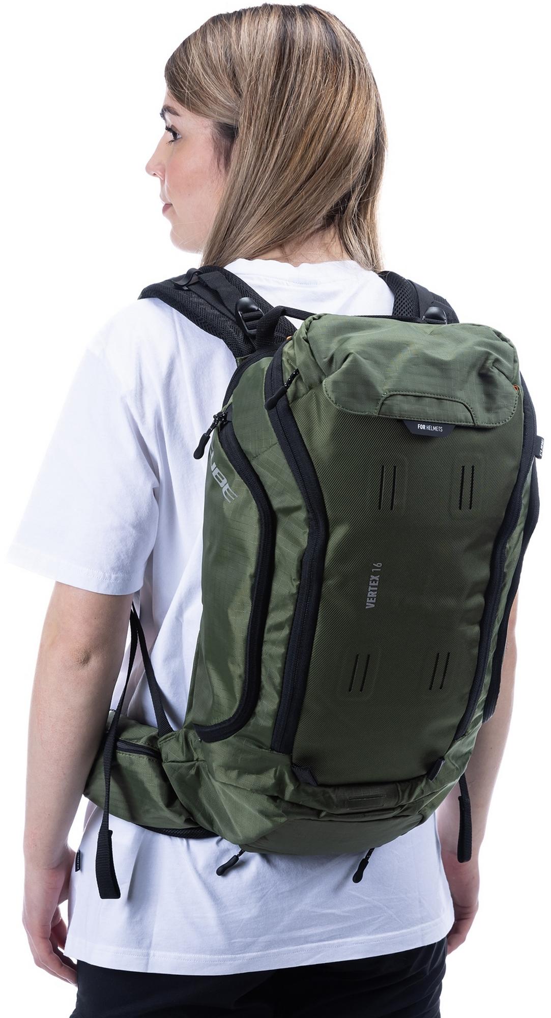Enduro fans listen up! The vertex 16 tm is our high-class backpack that's absolutely rammed full of practical features. An optimal fit courtesy of ergonomic shoulder straps, hip straps and cube's own nf ergonomics back system developed in-house adds up to a backpack that stays put no matter how hard you shred. We also added padding and ventilation so your back stays comfortable and fresh. The vertex 16 includes a sas-tec lb-l protector weighing in at a feather-light 150 g. We also included a protector strap, helmet carrier, goggle compartment and rain cover for maximum practicality. Internal compartments, a hip pocket, a smartphone pocket and two side tool compartments keep everything organised while you session the trails. And we also made it hydration system-compatible because that's how we roll! What's more: instead of a standard black lining, we used a contrasting colour to make it easier and faster to find what you need.