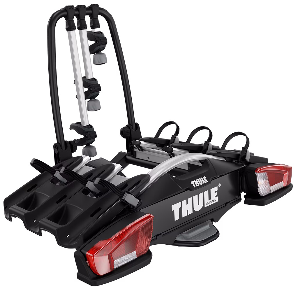 Compact and lightweight bike rack for everyday use (for 3-4 bikes).Easy mounting and adjustment of the bike rack before closing the tightening handle, thanks to the towbar couplings initial stabilityPossible to increase the load capacity to 4 bikes by adding a fourth bike adapterEasy mounting of bikes through detachable bike arms with lockable knobsCarries bikes with large wheelbases, thanks to single action extendable wheel holdersEasy trunk access even with bikes mounted, thanks to smart foot pedal tiltSimple to fasten wheels, thanks to long wheel straps with pump bucklesSimple to fold flat and store fits most car bootsPre-assembled, no tools requiredLocks the bikes to the bike rack and the bike rack to the towbar (locks included)IMPORTANT: Please check compatibility before buying - https://www.thule.com/en-gb/gb/buyers-guideMax number of bikes: 3 (4 with adapter)Load capacity: 60 kgMax bike weight: 25 kgSize: 126 x 74 x 80 cmFolded dimensions: 103 x 74 x 35 cmWeight: 19 kgFits frame dimensions: 22-80 mmDetachable frame holdersDistance between bikes: 19 cmCarbon frame compatible (Adapter/s required: Thule AcuTight Knob, Thule Carbon Frame Protector)Wheel mounting on adjustable holders: Pump bucklesTilt function (with bikes)Fits cars with exterior spare tyre (Adapter/s required: Thule VeloCompact Spare Wheel Adapter(Rear lightsPower connector: 13-pinOne Key System compatibleLockable bike-to-rackLockable rack-to-vehicleCity CrashGS Mark Quality Seal for Thule product (GS Geprufte Sicherheit)Automechanika-Inno-Award-Thule ProductAccessories for Thule VeloCompact 3 13-pin (not included, can be ordered separately):Thule VeloCompact 4th Bike AdapterThule Loading RampThule Bike Frame AdapterThule VeloCompact Spare Wheel AdapterThule Wheel AdapterThule Adapter 9906Thule AcuTight KnobThule Wheel Strap LocksThule One-Key System 4-pack