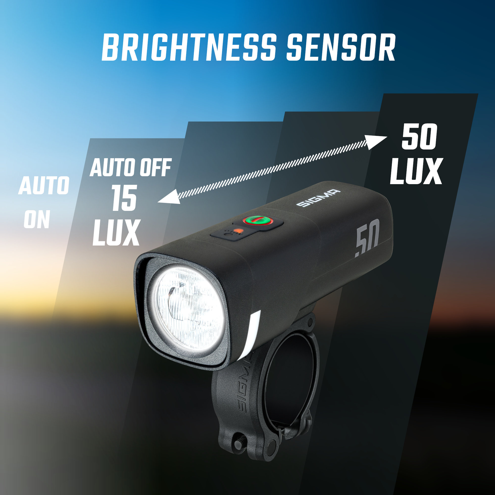 - AUTOMATIC LIGHT ADJUSTMENT The AURA 50 thinks for itself: In auto mode, an integrated brightness sensor automatically adjusts the light intensity depending on the ambient light. This means you always ride with the optimum lighting and use the battery particularly efficiently.