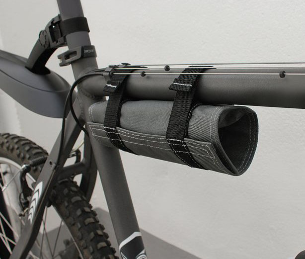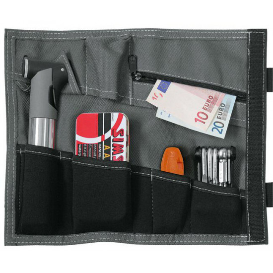 TOOL WRAP, the bicycle bag made of sturdy nylon with straps for frame or handlebar mounting. The bag features storage compartments e.g. for mini pump, repair kit, tire levers, mini tools, or small change.