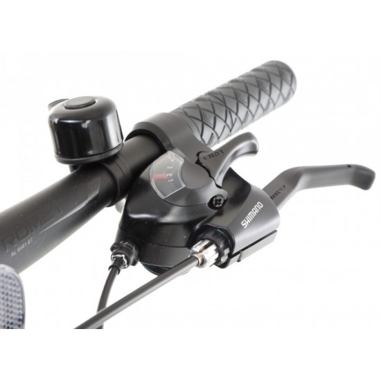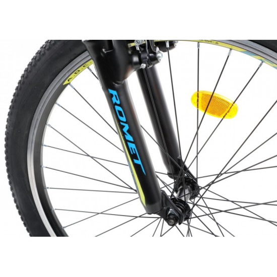 Frame: Aluminium 6061Fork: suspensionSpeeds: 21 speedShifters: Shimano ST-EF41 3 speed / Shimano ST-EF41 7 speedFront derailleur: Shimano Tourney TY300Rear derailleur: Shimano Tourney TY300DCrankset: 42/34/24T 170 mmBrakes: V-brake Alhonga HJ-811AD7 aluminiumTires: 26 x 2.00 (50-559)Rims: aluminium doublewallHubs: Front: JoyTech JY-433 steel / Rear: JoyTech JY-434 steelFreewheel: 14-28T 7 speedHandlebar: Romet aluminium 600 mm 15' FOVStem: Romet aluminium 60/90 mmSeat post: aluminium 27,2 mm 300 mmSaddle: RometPedals: FP-804Weight: 13,4 kg