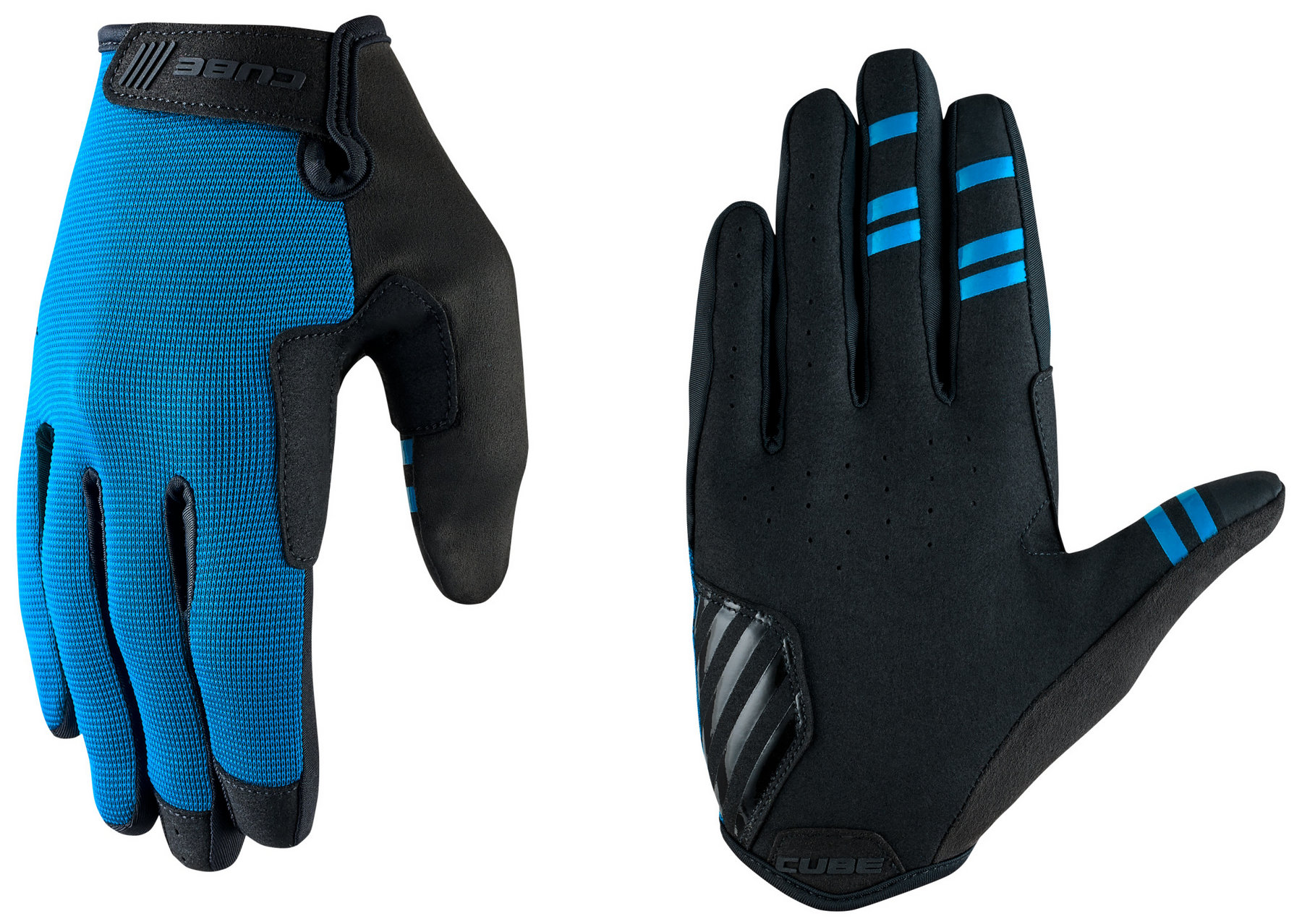 The long-finger Gravity gloves from CUBE are engineered for the extreme demands of high-performance off-road riding, providing optimal durability, control and rider comfort on aggressive XC trails, bike parks and pump tracks. The highly abrasion-resistant upper is specifically designed to withstand the intense rigours of MTB riding, ensuring long-lasting durability in rough conditions. The ventilated palm features a minimalist padding concept for enhanced bar feel and direct feedback, while touchscreen compatibility on the thumb and forefinger ensures seamless device operation. Grip-printed fingertips further optimise traction and control, delivering a secure handlebar connection in all weather conditions. A close-fitting cuff with a shaped hook-and-loop tab provides a secure, adaptive fit, while the integrated microfibre nose wipe adds practical functionality. The ergonomic pre-shaped construction enhances overall comfort and dexterity, allowing riders to maintain full focus on the trail ahead.