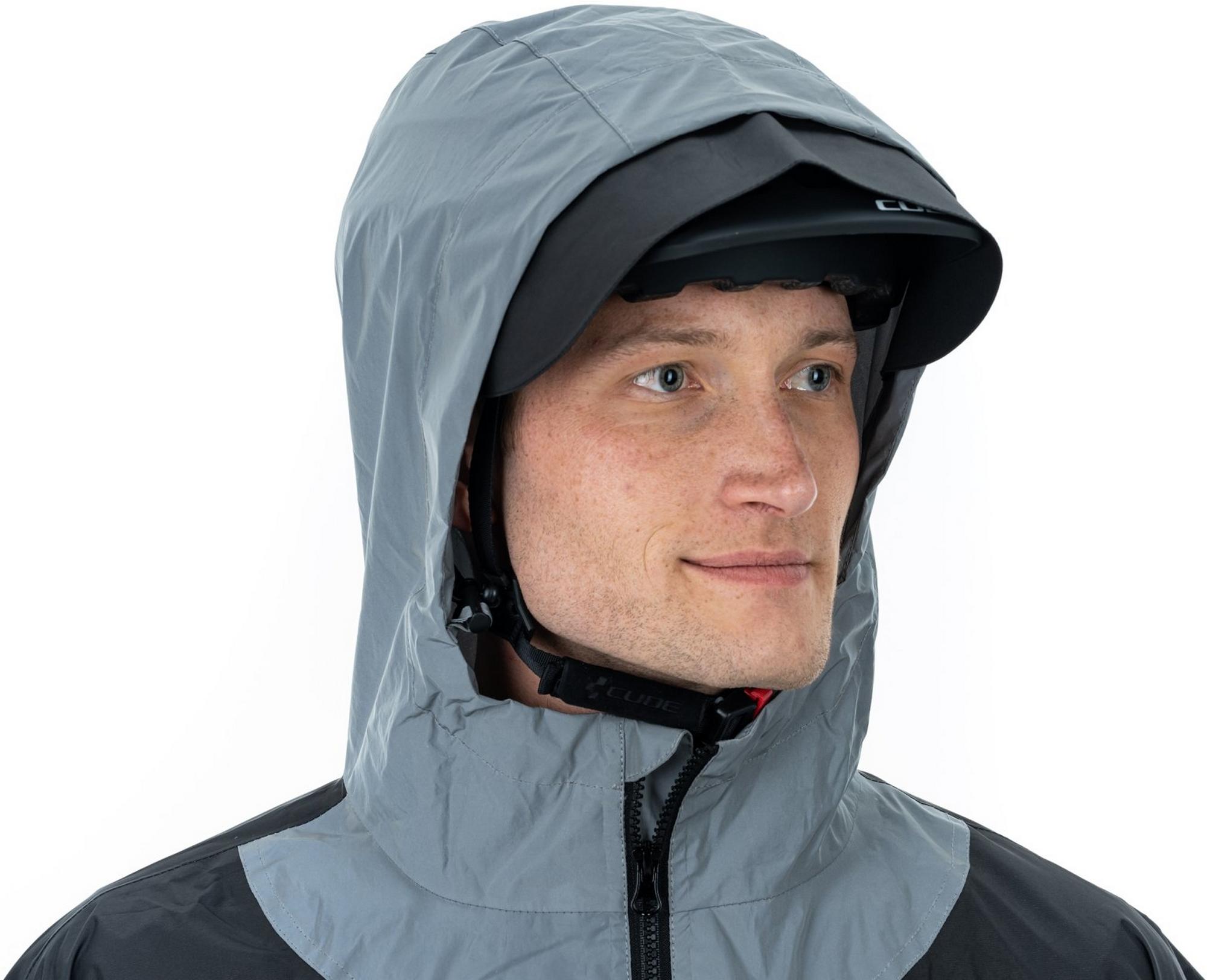 - Hood can be worn above the helmet