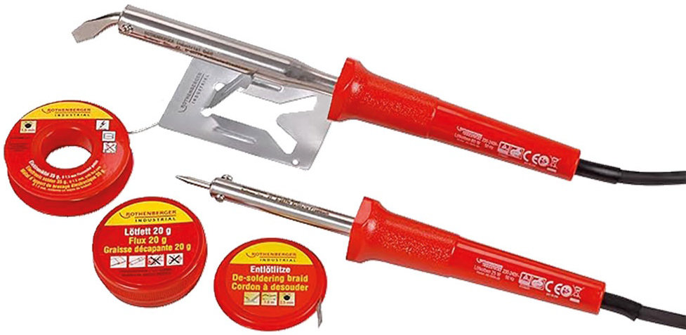 The soldering flux grease ensures better flow and adhesion of the solder metal on many materials. The desoldering braid enables the removal of excess liquid solder and makes ensures the removal of solder from joints quick and easy.