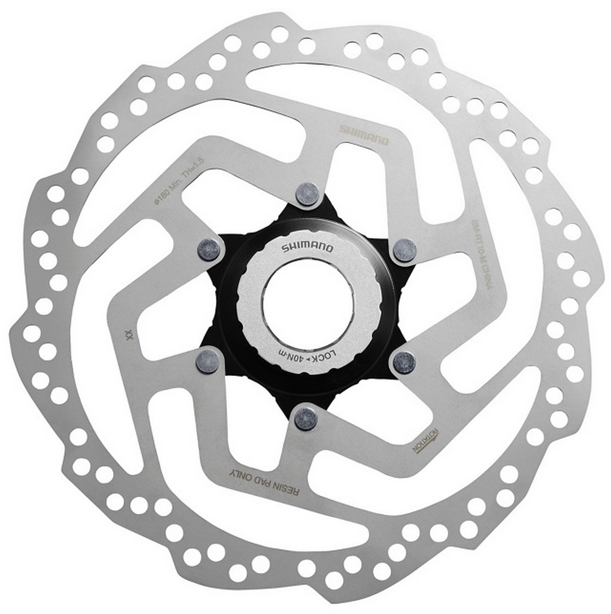 Original Shimano SM-RT10 Centerlock disc suitable for Shimano Tourney brakes. Only for Resin brake padsDiameter: 180 mmWith centerlock ring (steel)Material: polished stainless steelWeight: 211 gPlease do not exceed the disc specifications of your fork/frame.The CENTER LOCK system makes an easy rotor installation possible with spline mount and a lock ring. The lock ring mounting system reduces the total working hours by shortening the amount of time of both installation and de-installation. In addition, the secure fixing by the spline mount enhances precision and rigidity while improving braking efficiency.
