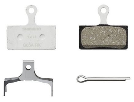 Shimano G05A disc brake pads made of resin and equipped with aluminum base plates. 50 % more wear resistant than its predecessor G03A.Brake compatibility (list may not be full): XTR BR-M9000, BR-M9020, BR-M987, BR-M985 / Deore XT BR-M8100, BR-M8000, BR-M785 / SLX BR-M7100, BR-M7000, BR-M675, BR-M666 / Deore BR-M6000, BR-M615 / Alfine BR-S7000, BR-S700 / BR-CX77 / BR-RS785 / BR-R785, BR-R517, BR-R317Weight: ~ 12 g (including spring and cotter pin)