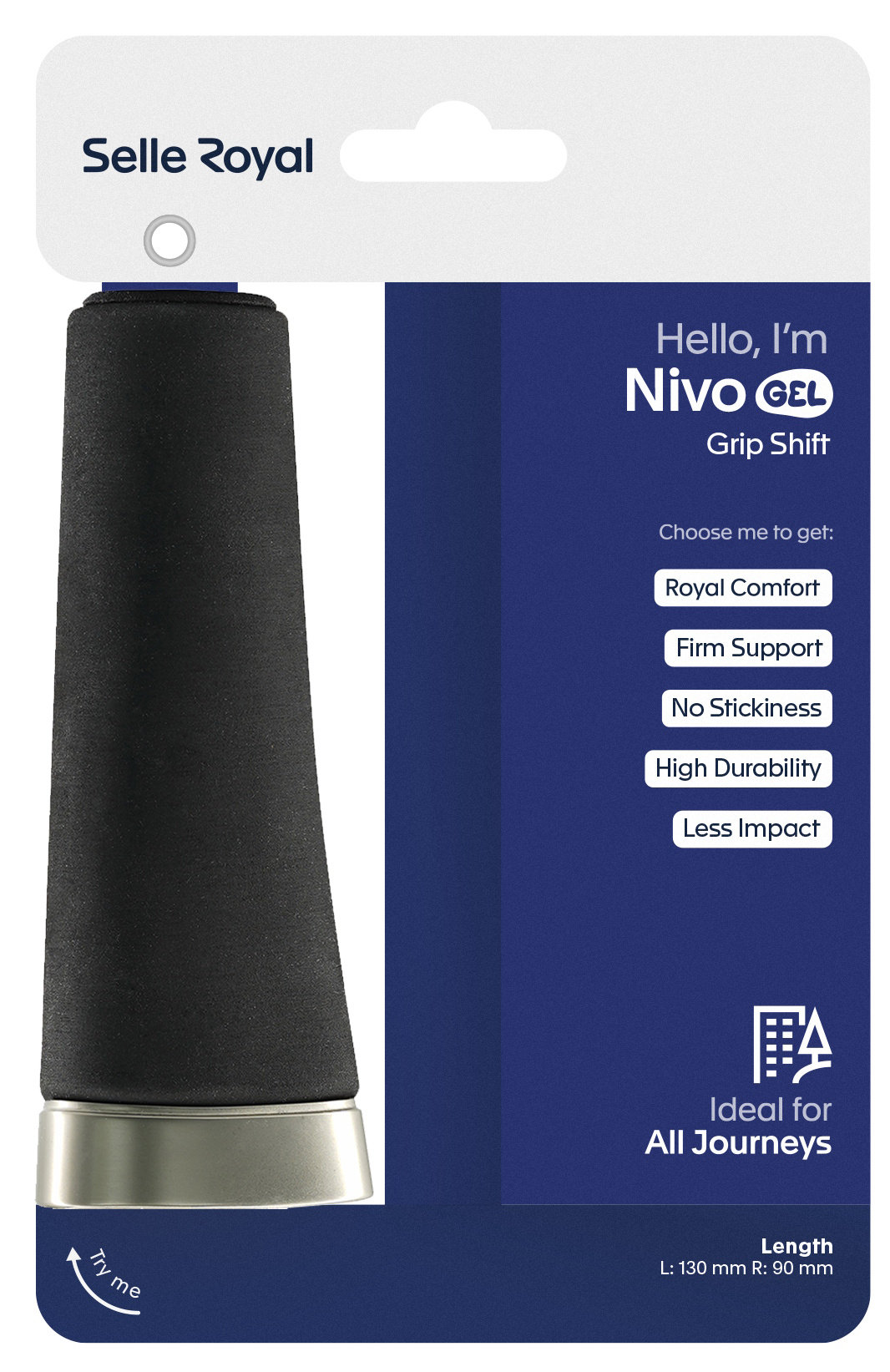 Ergonomic bike grips with gel-like comfort for relaxed riding. The Nivo Gel bicycle grips combine ergonomic design, innovative materials and the proven comfort of Selle Royal for a pleasant riding experience – ideal for everyday cyclists, touring cyclists and e-bike users. The gel-like feel ensures long-lasting comfort and effective damping of vibrations and shocks. The flat contact surface supports a natural wrist position and offers a generous palm rest, while the rounded grip profile ensures secure handling and a comfortable fit for all hand sizes. Thanks to the non-slip upper material, hands stay dry and clean even on longer rides – without a sticky feeling. The robust design with high abrasion resistance also ensures high durability and reliable performance, even with intensive use.