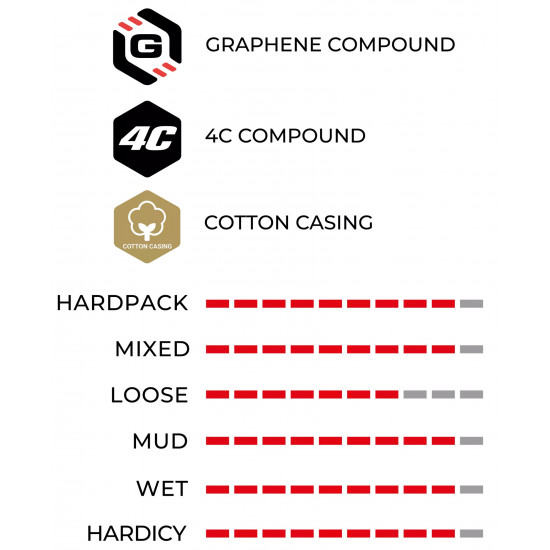 4C COMPOUND: Road tires need to deliver speed, control and durability. Vittoria 4C Graphene compounds are specifically formulated to give ultimate grip with the lowest possible rolling resistance, while still providing a long useful wear life. The center tread area uses two separate Graphene compounds; one at the base, and one at the surface. The base compound provides a stable foundation for climbing and braking loads, while providing protection from pinch flats and punctures. The surface compound is formulated to provide minimal rolling resistance, while delivering ultimate traction in both wet and dry conditions. The shoulder area of the tread also uses two separate Graphene compounds; one at the base, and one at the surface. The base compound provides a stable foundation for cornering loads, while providing protection from slices in the tread. The surface compound is formulated to provide ultimate cornering confidence, in both wet and dry conditions. All four Graphene 4C compounds work together to minimize tearing and extend useful wear life, in a range of terrain.