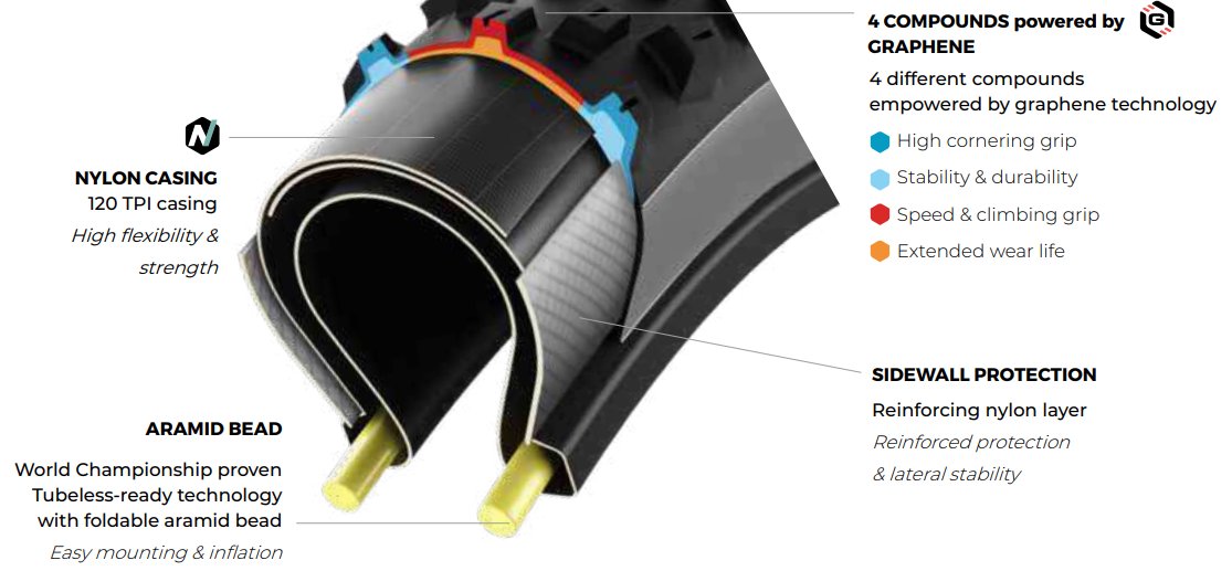 4 Graphene-enhanced Compounds in One Tread - Because of their power, e-bikes need treads that do not wear out fast. Graphene improves the tread durability and rolling. This trait is very important as it positively affects the battery consumption, extending the battery life. The 4C technology, the layering process allowing to place 4 different layer of rubber compound in the same tread, improves the knobs strength and flexibility. Therefore, they can better resist to the strong accelerations of electric bike (they do not tear off because of the higher torque) without compromising the grip.