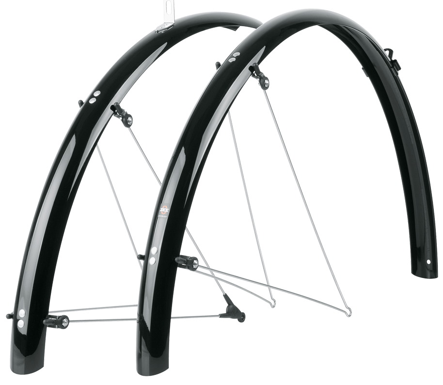 A real shine! Not only do the BLUEMELS SHINY mudguards from SKS look shiny, they also provide reliable protection from dirt and water. The mudguards are robust and rigid. Fenders feature a sandwich design with superfine aluminium strips embedded in plastic sheathing. Whether on dirt tracks or forest paths, the BLUEMELS SHINY provides excellent all-round protection mounting close to the tyre. The ASR safety release system releases stays should branches become trapped between the mudguard and the front wheel. Includes a struts kit, a stainless steel fixed bridge and mounting materials. Made in Germany.