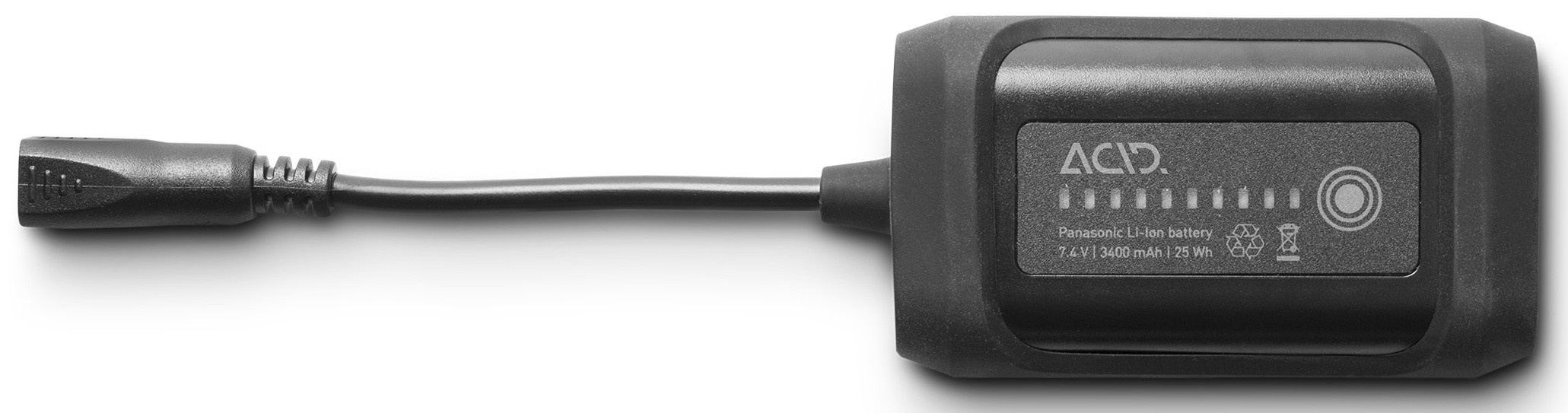 Replacement battery pack Panasonic Li-Ion / 7.4 V / 3400 mAh / 25 Wh for Acid helmet and head lamp HPA 1300 / 2000. The external rechargeable battery pack has a practical battery indicator which shows you the remaining energy.