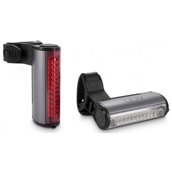 Safety light set includes: ACID HPA white LED and ACID HPA red LED with 120 (white) and 30 (red) lumens. Integrated rechargeable lithium-polymer battery, 6 light modes and silicone strap fastening with integrated clip attachment. Includes Micro-USB charging cable. Lights listed under "Outdoor" may not be affixed to bikes/vehicles or used on public roads in Germany.