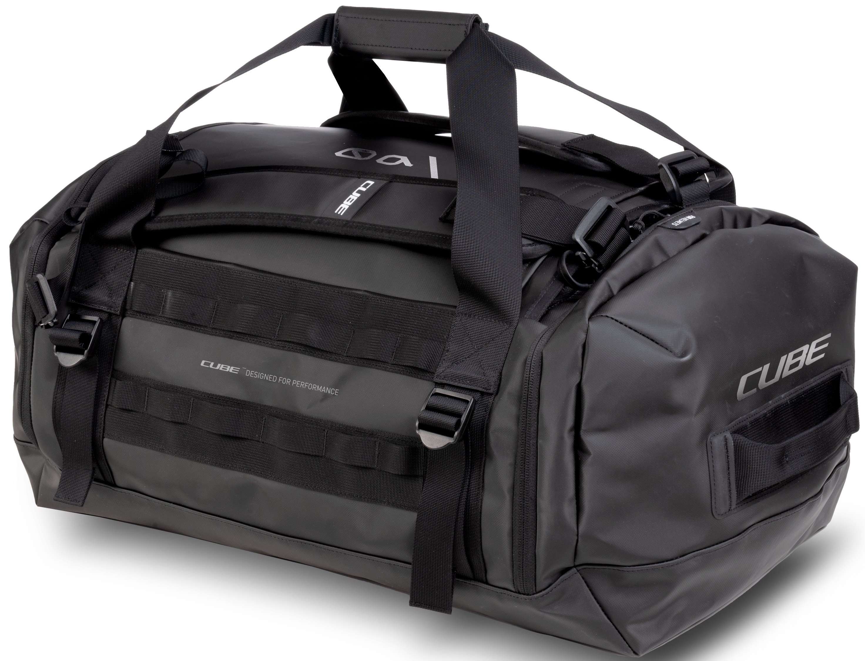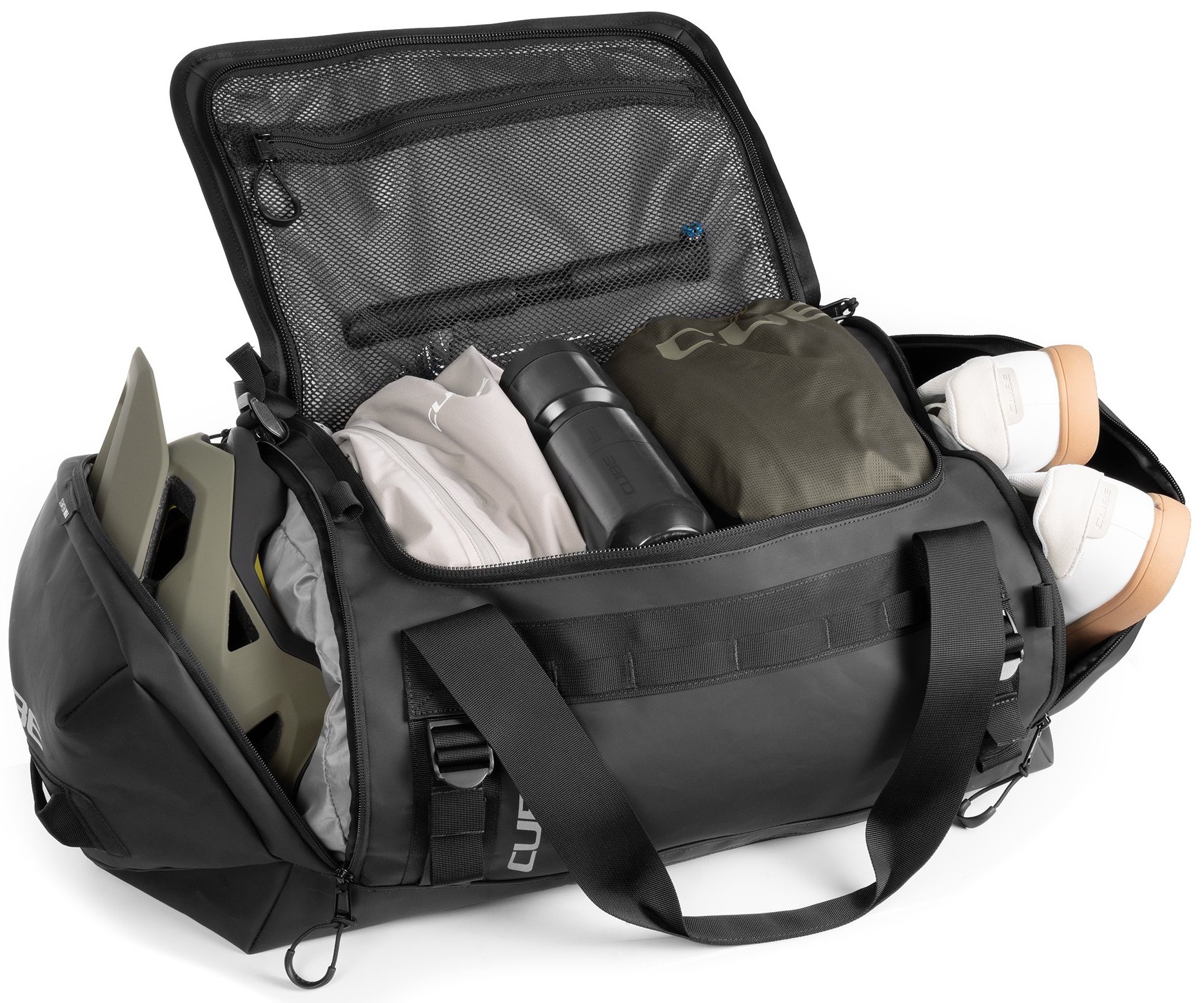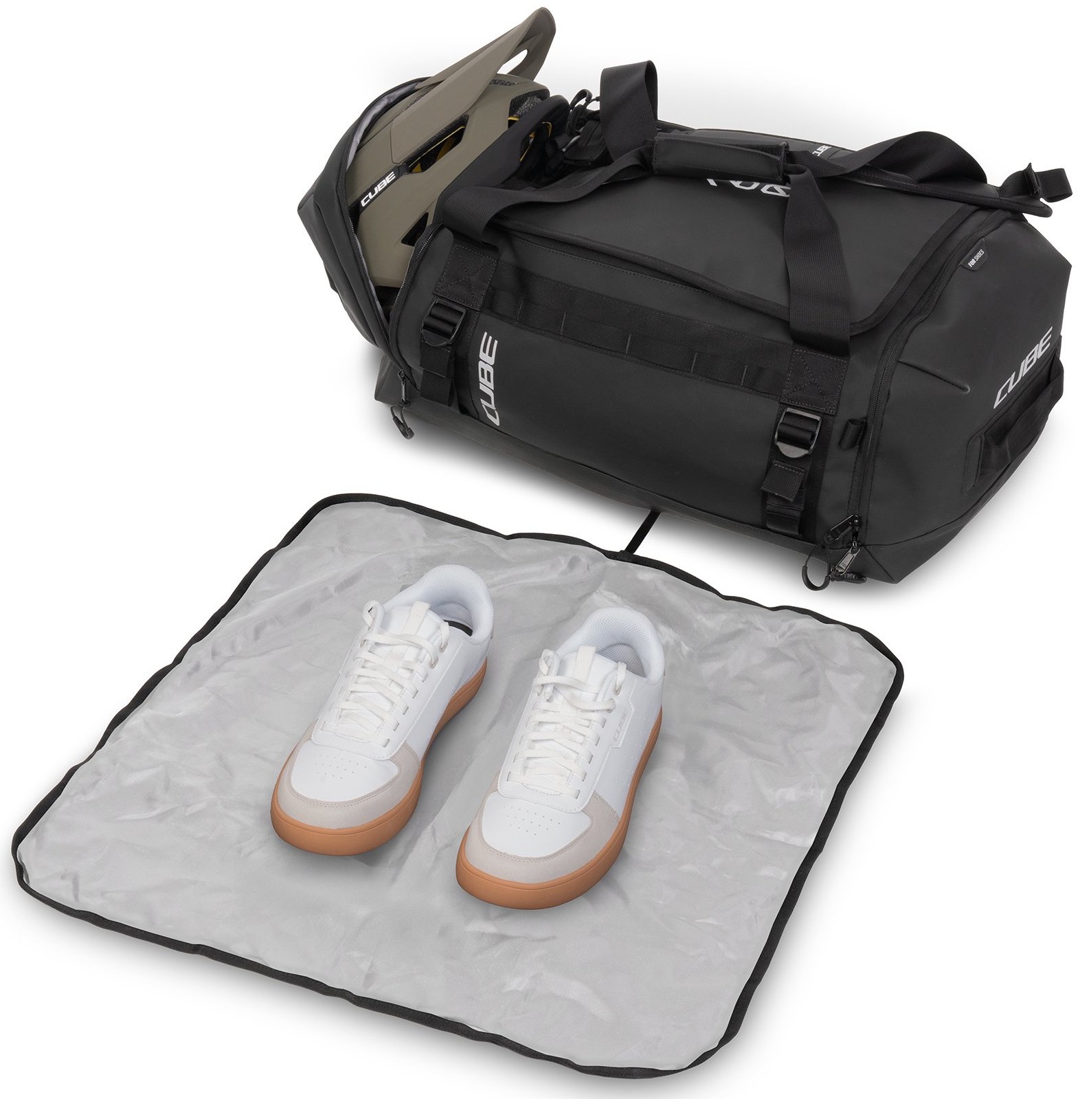 The CUBE Duffle Bag 60 is the perfect companion for travel, bike parks, training camps or race weekends. Removable shoulder straps allow for flexible carrying options, while the integrated MOLLE system offers additional attachment points for CUBE accessory bags, including the CUBE Wash Bag 4. A practical, foldable changing mat makes it easy to change on the go, and separate compartments for your helmet and shoes keep everything organised. Built from durable materials, this bag stands up to heavy use and reliably protects your gear – no matter where your adventure takes you.