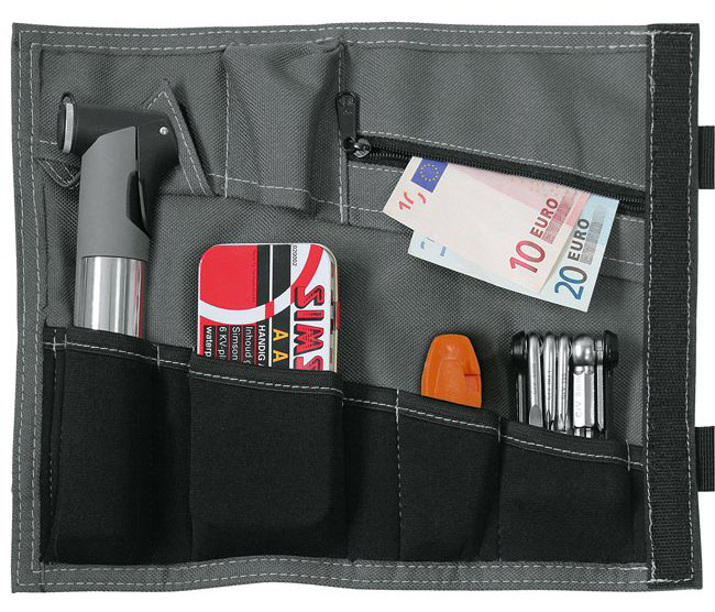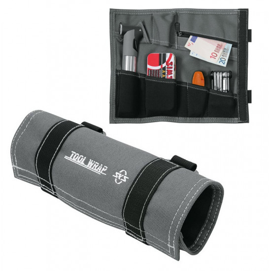 TOOL WRAP, the bicycle bag made of sturdy nylon with straps for frame or handlebar mounting. The bag features storage compartments e.g. for mini pump, repair kit, tire levers, mini tools, or small change.
