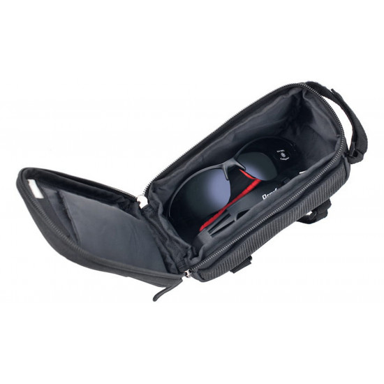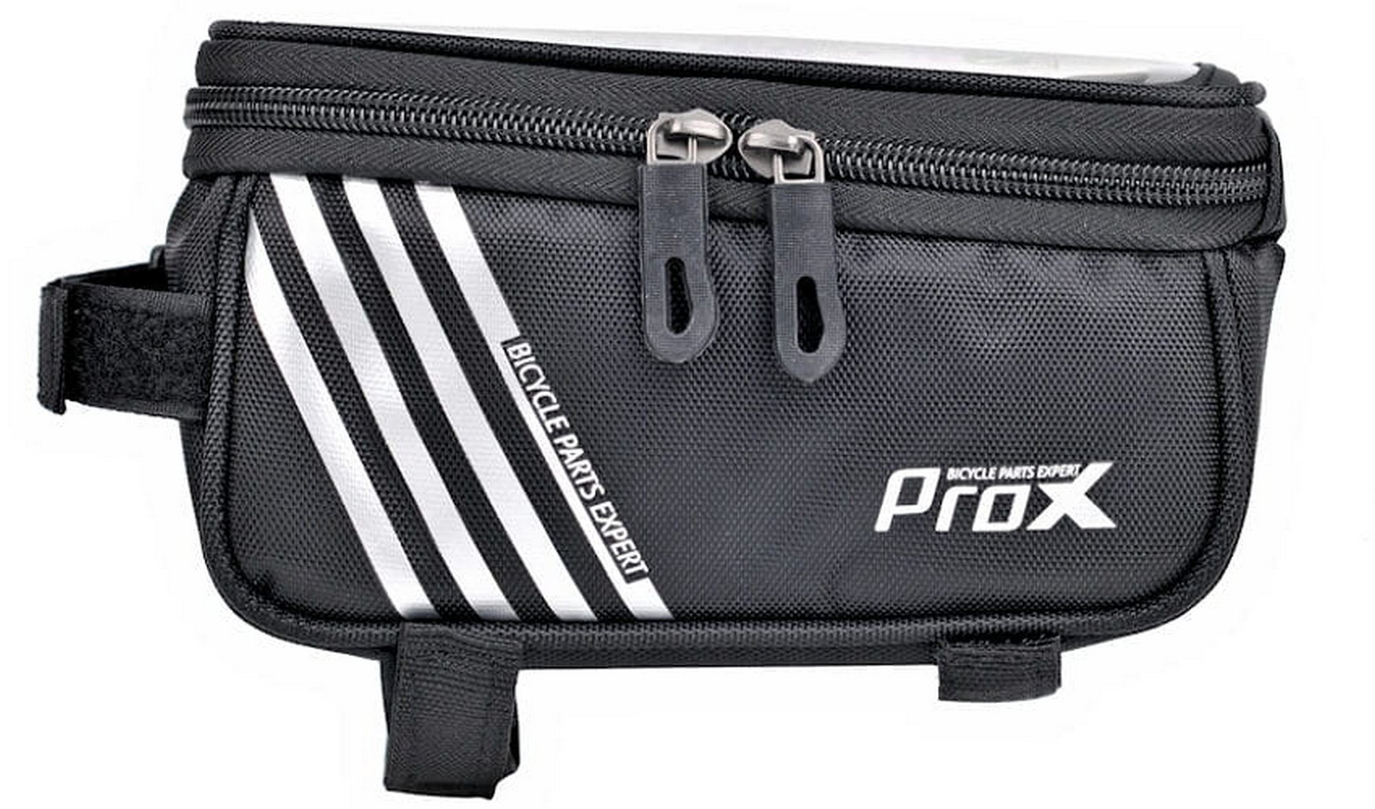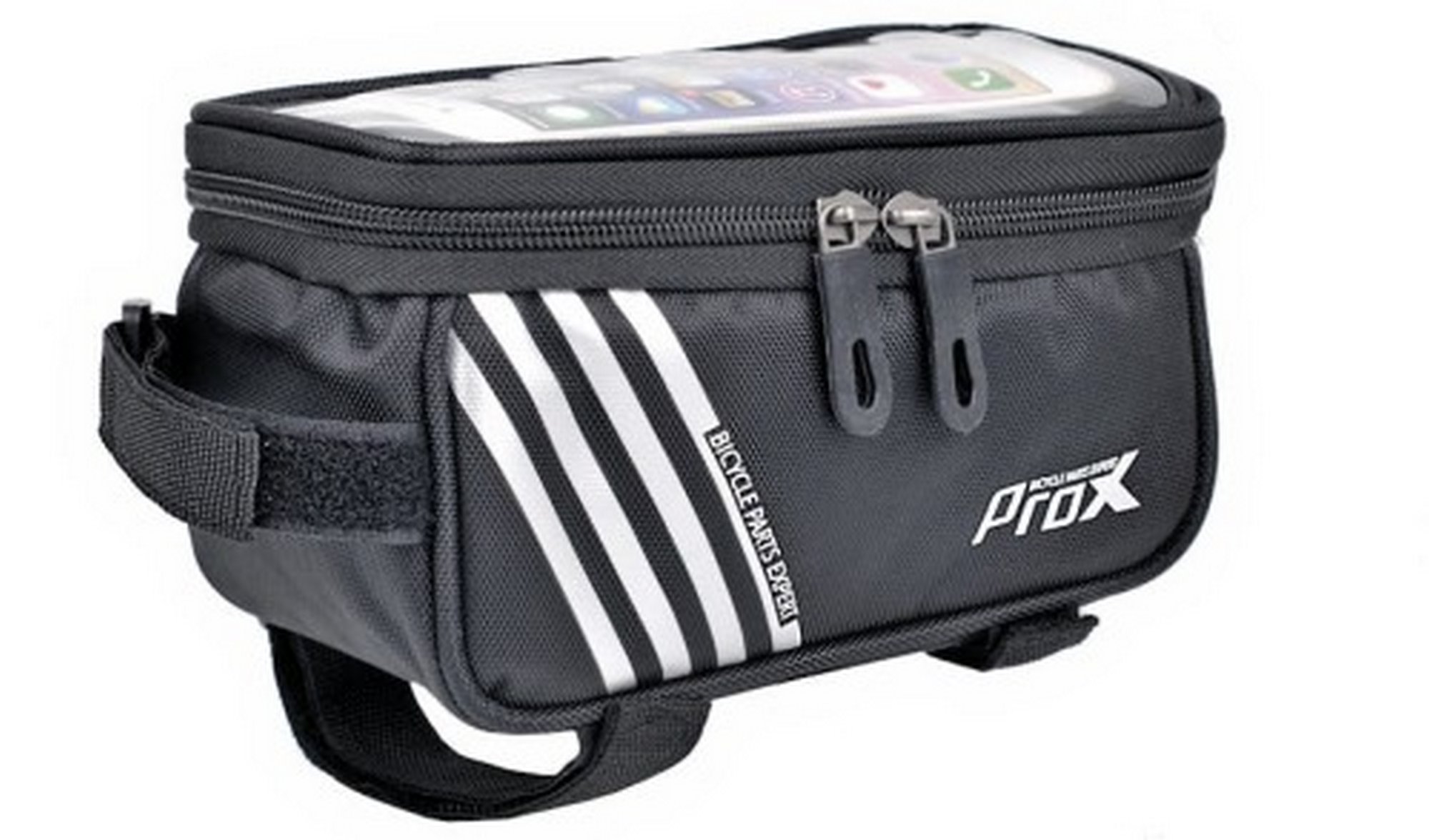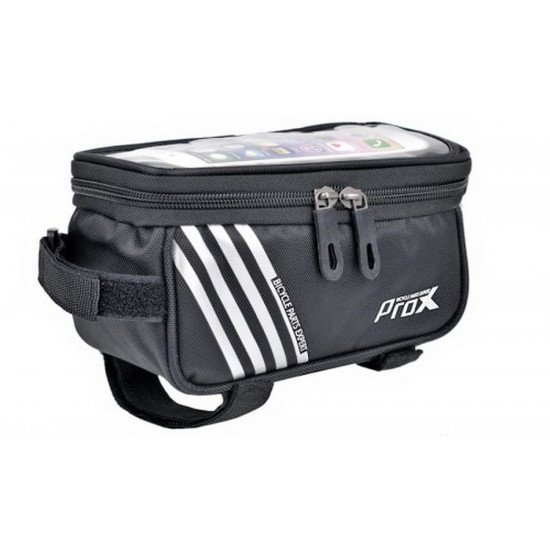- Frame pannier with phone pocketRoomy zipped compartment with two zippersFor a phone with a screen of up to 5.7 inches3-point attachment with Velcro strapsReinforced bottom and walls of pannier, reflective stripesMesh pocket on one sideMaterial: polyester / PVC meshDimensions: 18 x 9,5 x 8,5 cmWeight: 139gCapacity 1.2l