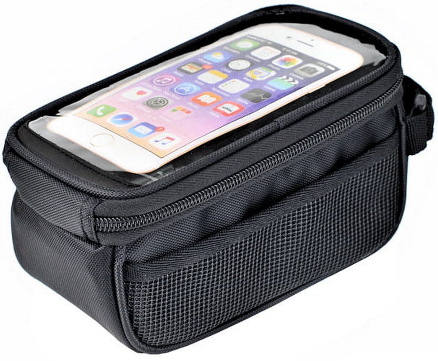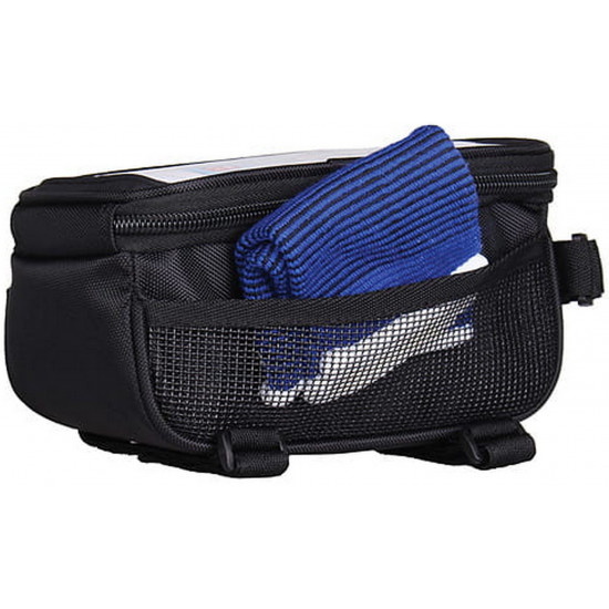- Frame pannier with phone pocketRoomy zipped compartment with two zippersFor a phone with a screen of up to 5.7 inches3-point attachment with Velcro strapsReinforced bottom and walls of pannier, reflective stripesMesh pocket on one sideMaterial: polyester / PVC meshDimensions: 18 x 9,5 x 8,5 cmWeight: 139gCapacity 1.2l