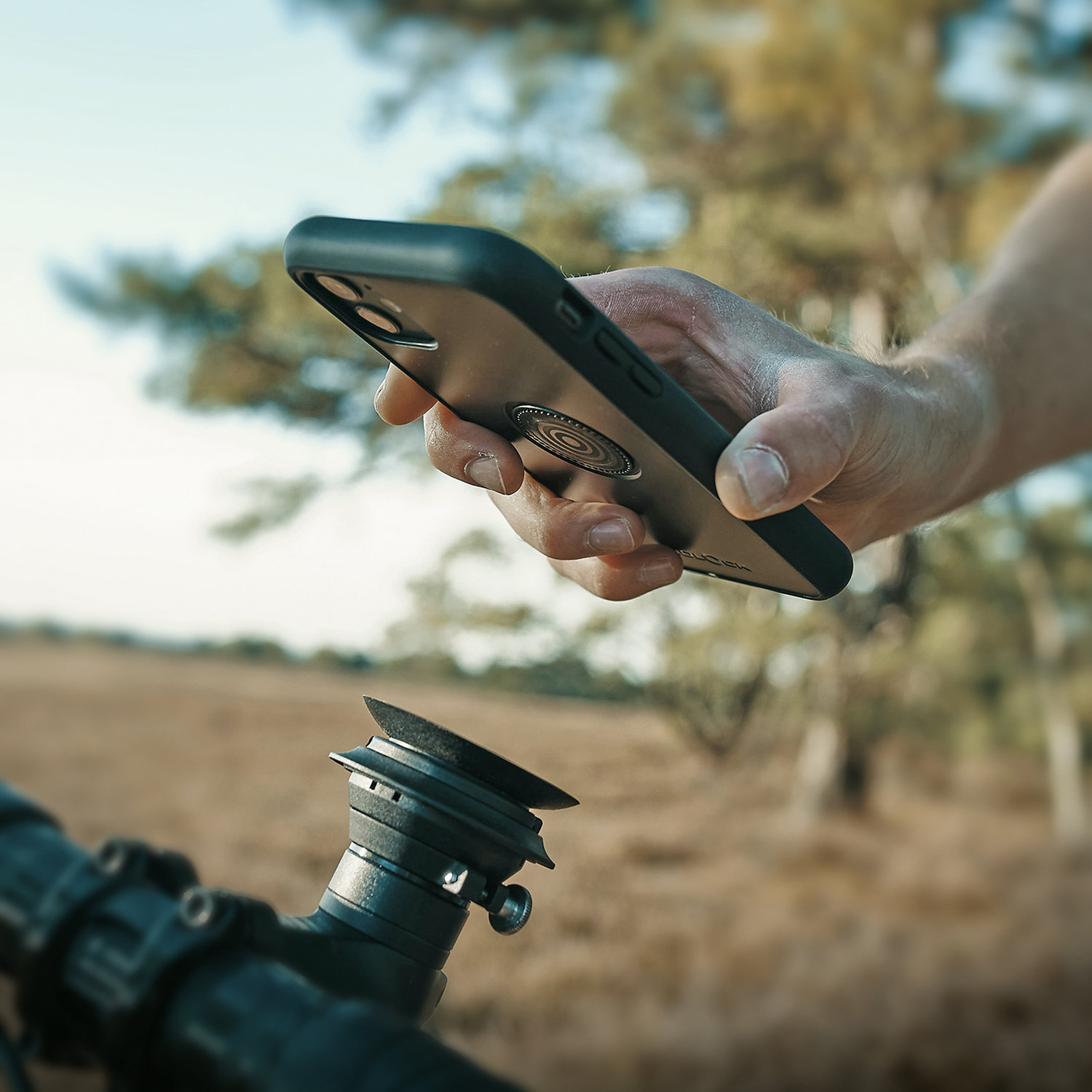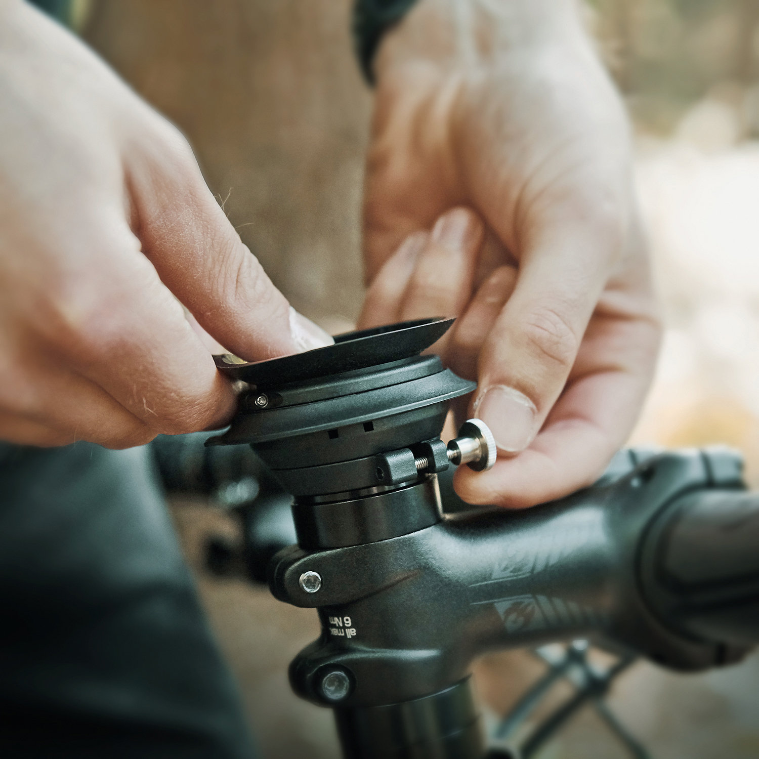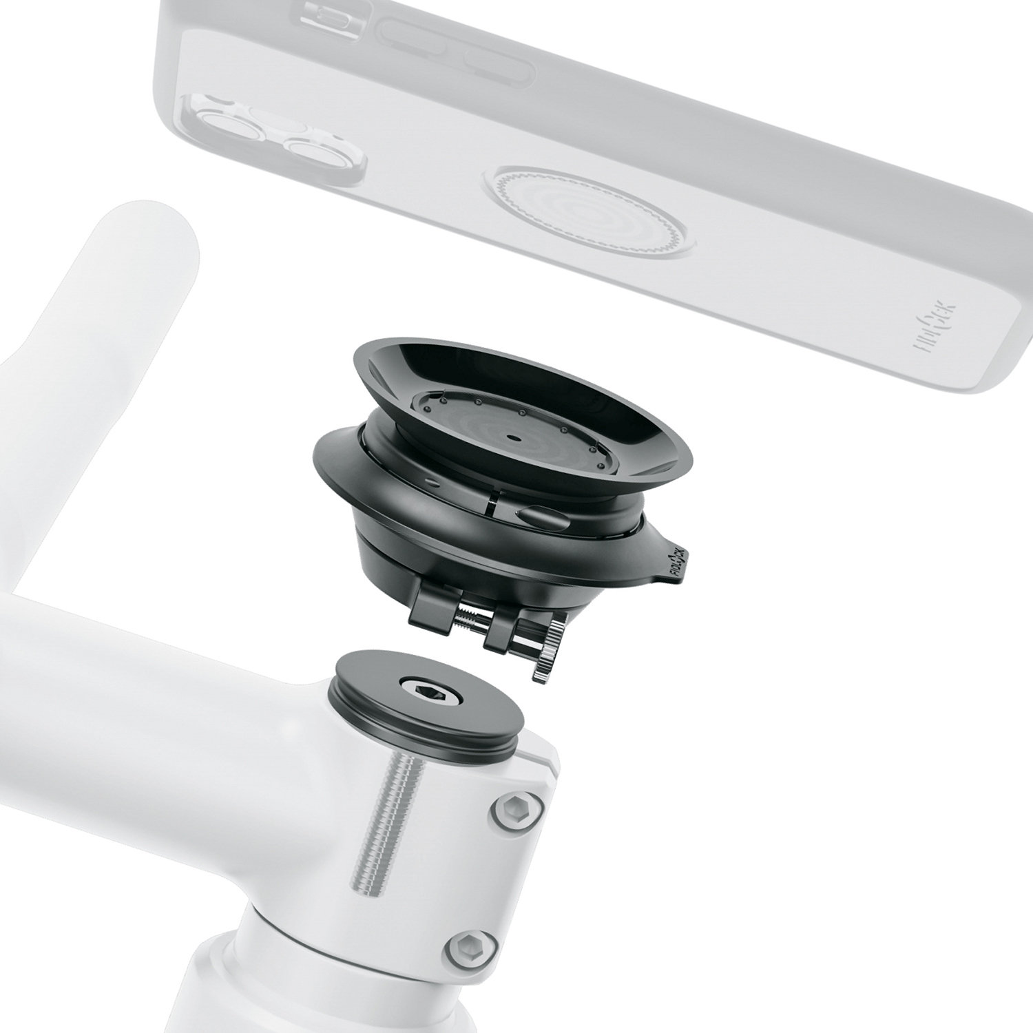 The ahead cap allows the VACUUM smartphone holder to be mounted directly on the bike stem. The cap is mounted on the head tube and serves as a base for the VACUUM mobile phone holder. This is then placed on the cap and fixed with a clamp using a knurled screw or an Allen screw.