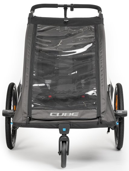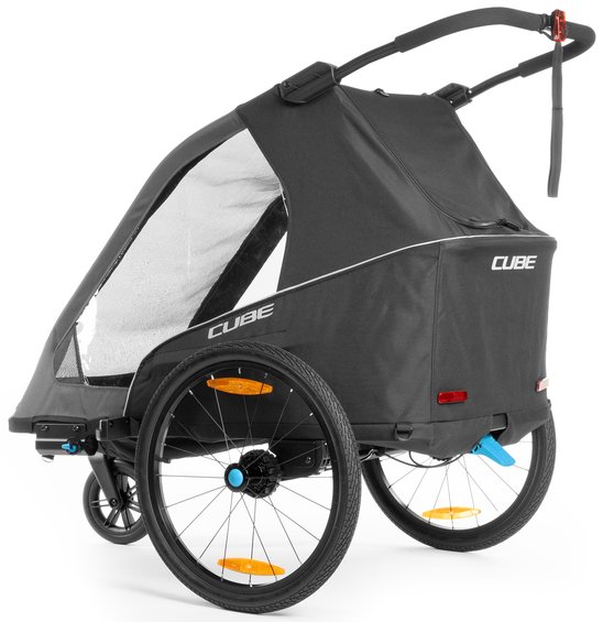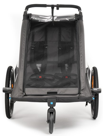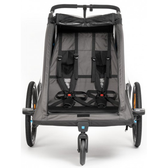 The Double PURE kids' trailer is packed with clever features to make life easier. Side ventilation ensures a comfortable climate inside the trailer, while the integrated suspension absorbs bumps and vibrations as you travel. The quick-release wheels are easy to get on and off for storage, etc. Reflective elements improve visibility in traffic and a generously proportioned luggage compartment offers plenty of space for your bags. Comes with a tow bar, safety flag, buggy wheel and rear light with batteries. Rated for a maximum load of 42 kg with a tongue weight of 1–8kg.