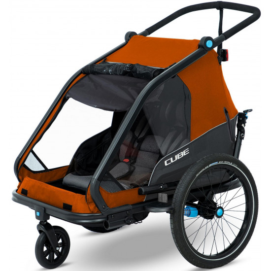 The cube kids trailer double cmpt is the perfect everyday companion. This sophisticated multi-talent is a bike trailer and kids' buggy in one. A large insect net extending across the front and sides keeps the bugs out without affecting the circulation of fresh air. Kids can nap in peace courtesy of the sun shade to protect against the bright light. The splash protection means you can keep riding even when it's muddy and wet outside while the kids stay dry. Seat and back padding and a headrest with helmet pocket make sure the little ones ride in comfort. Individually adjustable suspension can be adapted to the terrain and loading weight. For even more flexibility, the trailer is compatible with the jogger kit (available separately).