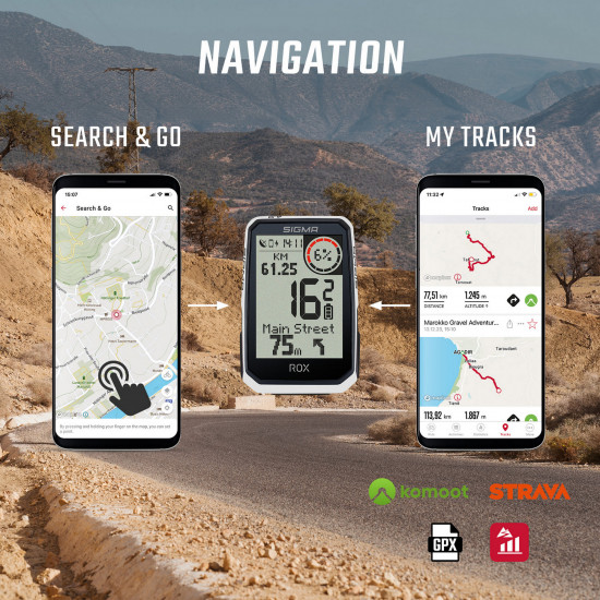 - SEARCH AND GO Navigation allows you to find a specific location and navigate there. You can enter an address into the SIGMA RIDE app on your smart phone or click on a point on the map. Trail preferences (bike trails, dirt roads, paved roads, and running/hiking trails) can be set individually. The track thus created can be started directly on your ROX 4.0 ENDURANCE or saved in the RIDE app for later.