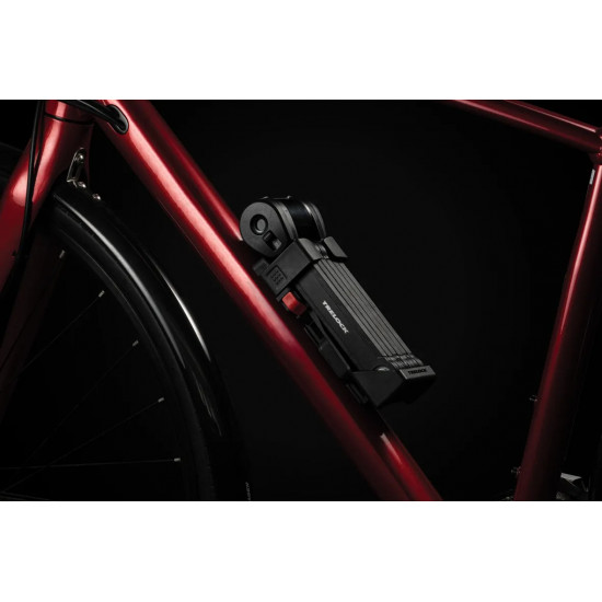 The FS 580 is our strongest folding lock in the series. The special highlight, however, is the back of the bracket: here, an Apple AirTag or a Samsung SmartTag can be hidden inconspicuously and securely. With the tags, the bike can be tracked via smartphone with minimal effort. The rubberized links made of hardened steel can be unfolded up to 90 cm in length. Locking a bike to a stationary object is very easy. For convenient locking, the lock is equipped with a 360 degree rotatable insertion area on the lock head and a reversible key. The IN-X cylinder is protected from dust and dirt by a cover. The 90 cm version comes with the new X-PRESS bracket. The locking mechanism of the X-PRESS holder makes it even easier to remove and insert the lock. To remove the lock, press the red button and the lock is released. To secure the lock in the bracket again, simply press the brackets together.