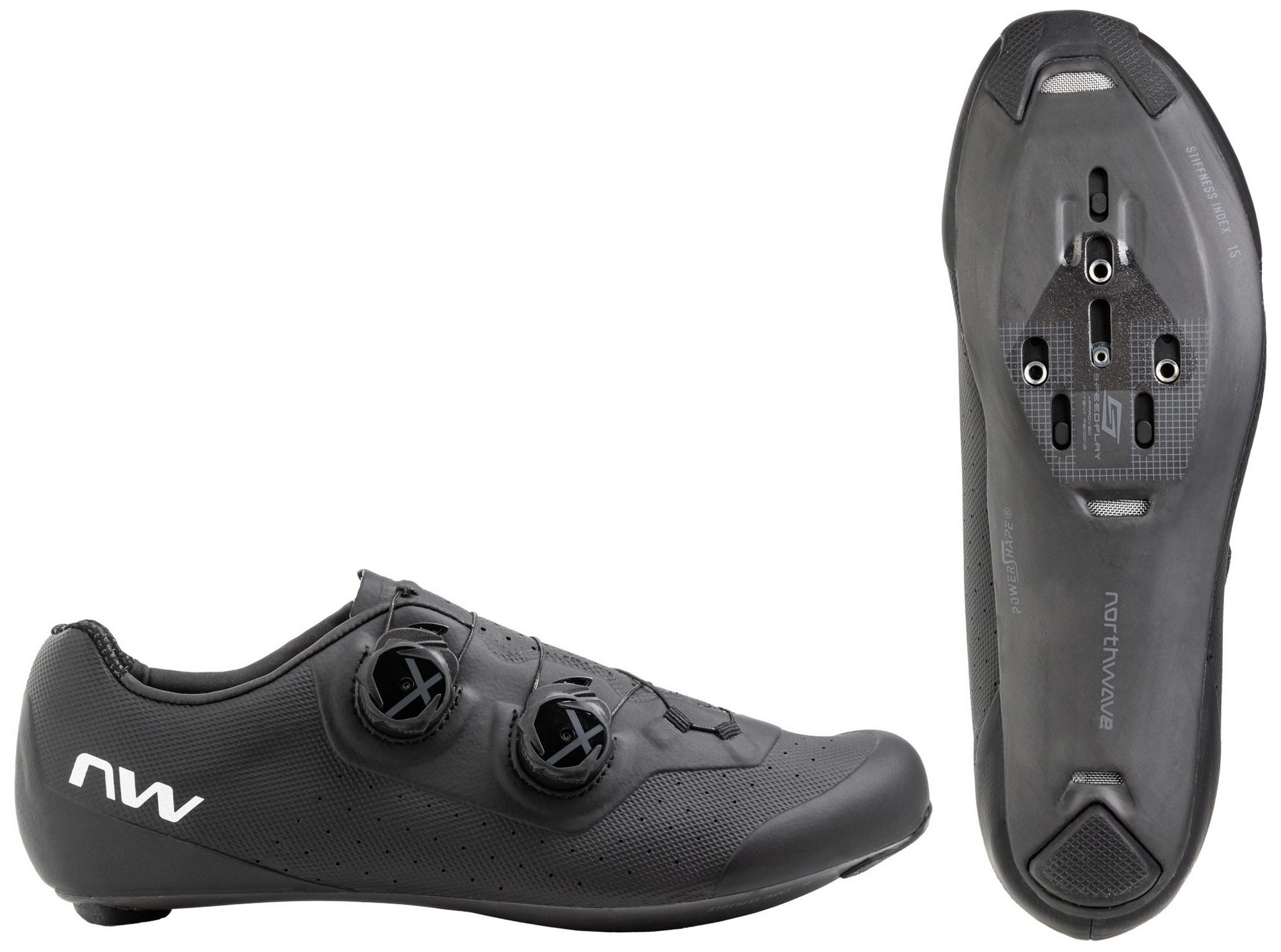 POWERSHAPE CARBON 15 – Made from 100% unidirectional carbon, it has been developed to ensure 100% of rider power is transferred to the pedals without wasting any energy. The secret lies in the exclusive patented PowerShape system for the arch; dozens of prototypes were created to find the perfect shape and thicknesses to adapt to all feet and arches. It also has a special adaptor, so is compatible with Speedplay pedals.