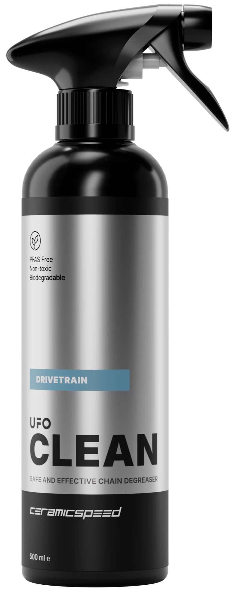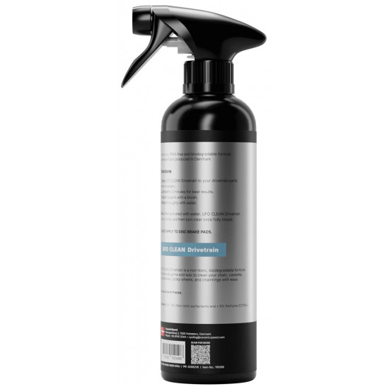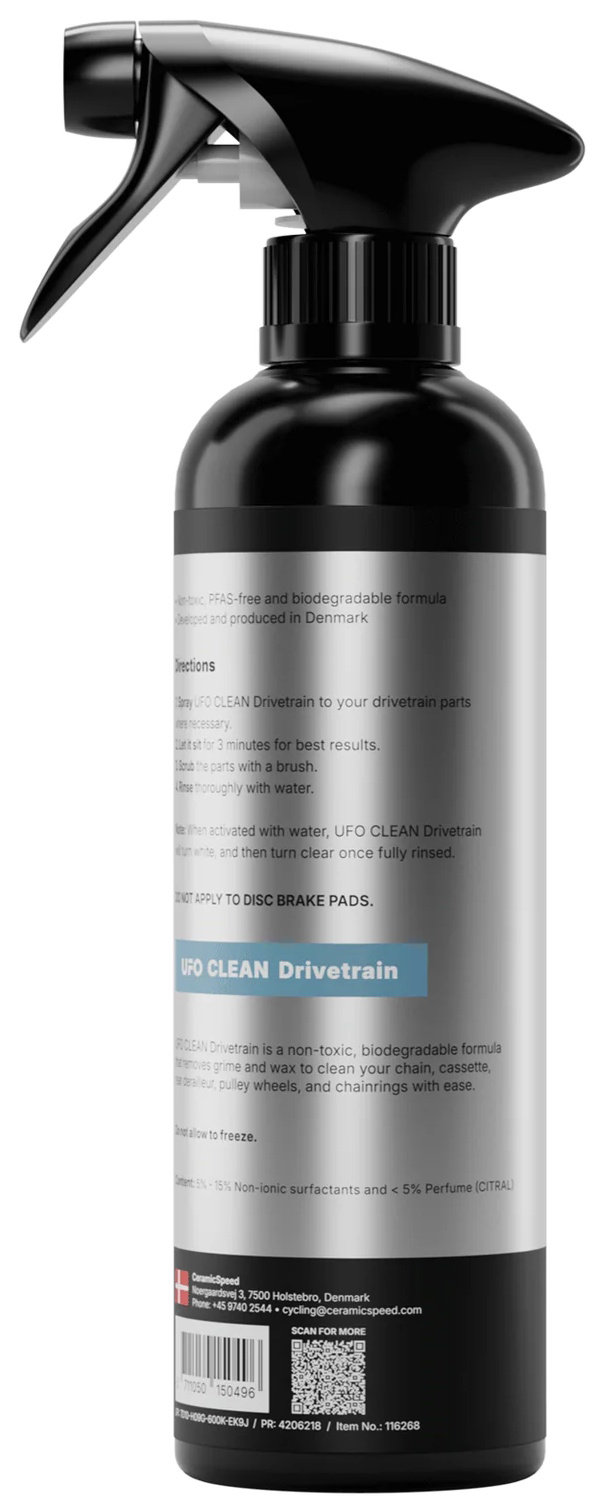 - Use by spraying UFO Drivetrain Cleaner to your chain, cassette, and chainrings and scrub with a brush to break down surface contaminants, waxes, or grease. Let sit for 3-5 minutes for the best results.