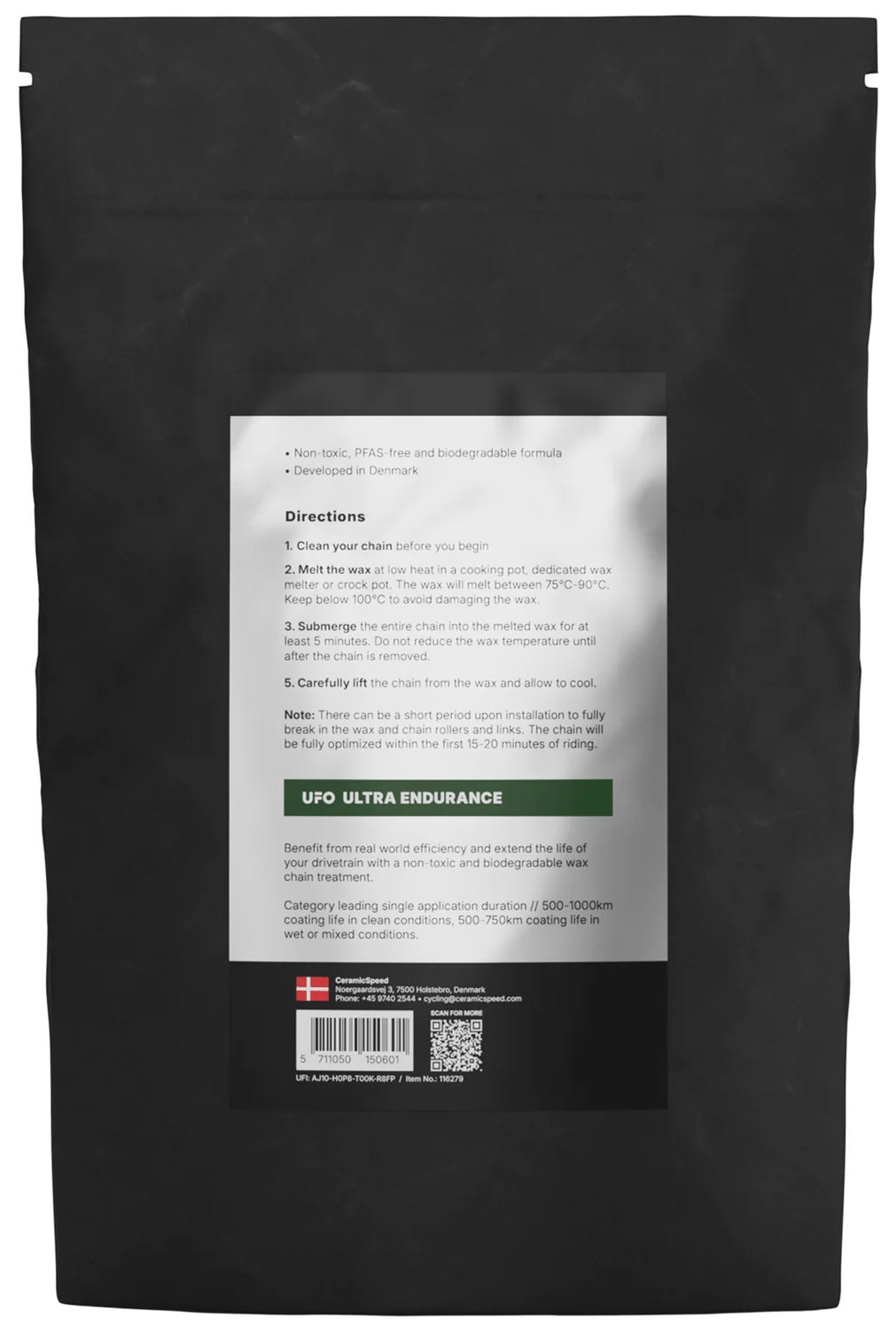 How far can you ride with a single hot wax application? - Ceramicspeed asked itself this question, which led its in-house chemists to develop the UFO Ultra Endurance Wax. It sets completely new standards for extremely long-lasting performance and quiet performance in different weather conditions. Your chain stays clean and perfectly lubricated for longer. Conventional chain oil, on the other hand, tends to attract dirt. In test rides, riders achieved a range of over 1000 km in varying conditions with just one application.