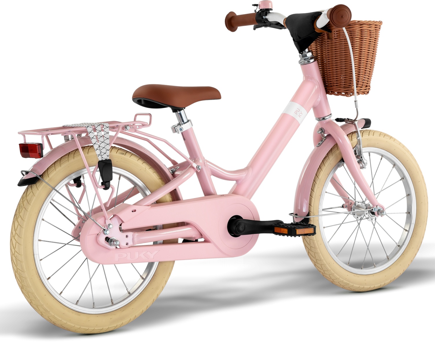 The PUKY Safety Set, consisting of handlebar pad, bell, safety handlebar grips, closed chain case and side stand, provides additional safety and practical features. The frame's durable powder coating ensures a long-lasting appearance and protection against corrosion.