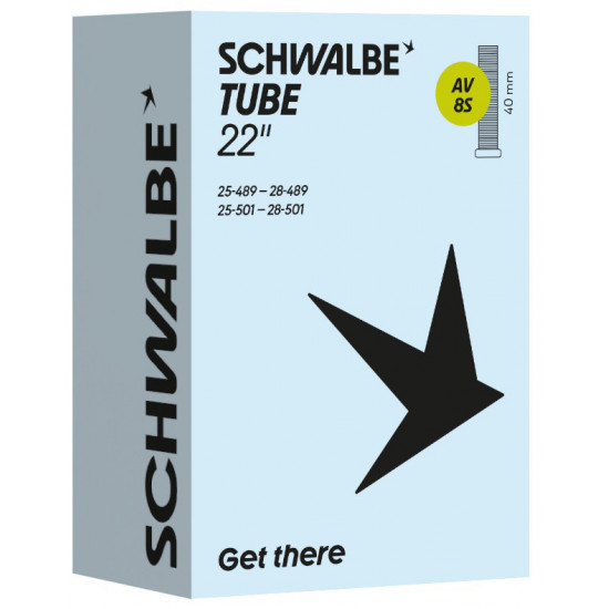 Schwalbe standard bicycle inner tube no. 8S. For bicylce tires in 22" inch (ETRTO 25/28-489, 25/28-501). Retains air for an above-average length of time. Thanks to the best material quality and uniform wall thickness. Maximum reliability that has proven itself millions of times over.