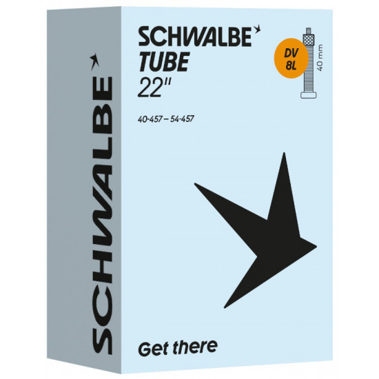 Schwalbe standard bicycle inner tube no. 8L. For bicylce tires in 22" inch (ETRTO 40/54-457). Retains air for an above-average length of time. Thanks to the best material quality and uniform wall thickness. Maximum reliability that has proven itself millions of times over.
