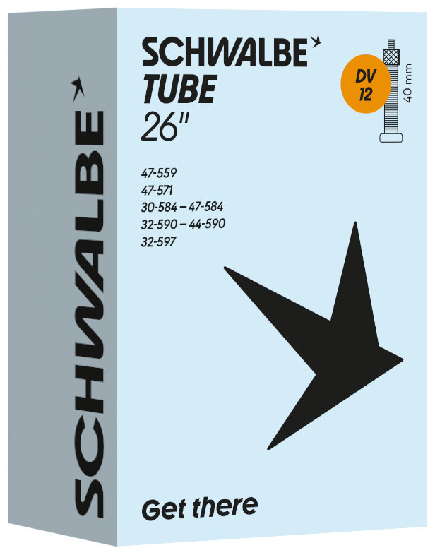 Schwalbe standard bicycle inner tube no. 12. For bicylce tires in 26" inch (ETRTO 47-559, 47-571, 30/47-584, 32/44-590, 32-597). Retains air for an above-average length of time. Thanks to the best material quality and uniform wall thickness. Maximum reliability that has proven itself millions of times over.