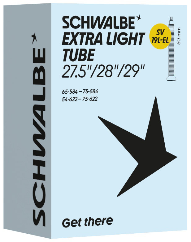 Schwalbe EXTRA LIGHT bicycle inner tube no. 19L-EL. For bicylce tires in 27.5"/28"/29" inch (ETRTO 65/75-584, 54/75-622). Lower weight, with the same reliability as a Schwalbe standard inner tube.