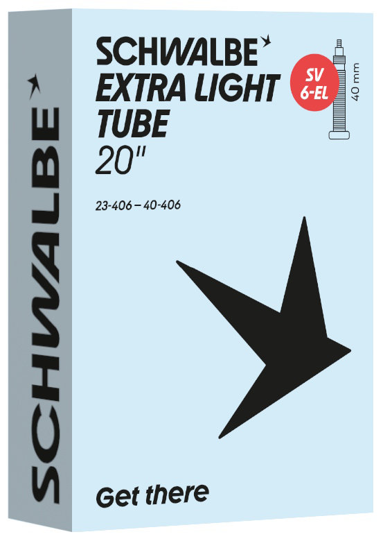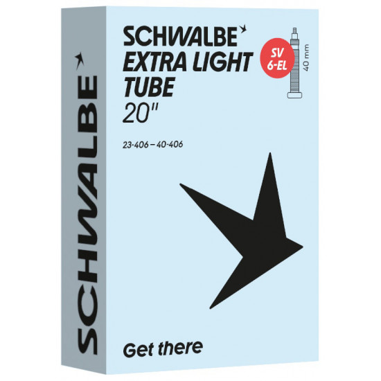 Schwalbe EXTRA LIGHT bicycle inner tube no. 6-EL. For bicylce tires in 20" inch (ETRTO 23/40-406). Lower weight, with the same reliability as a Schwalbe standard inner tube.
