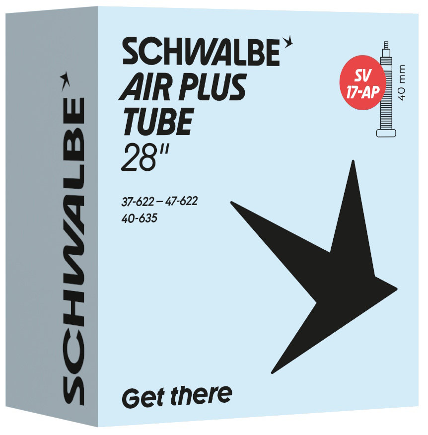 Schwalbe AIR PLUS bicycle inner tube no. 17-AP. For bicycle tires in the size 28" inch (ETRTO 37/47-622, 40-635). Holds the air even longer thanks to wall thickness even longer. Less frequent re-inflation necessary. Also protects above-average protection against punctures.