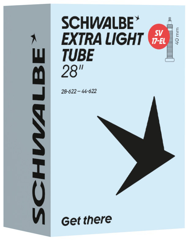 Schwalbe EXTRA LIGHT bicycle inner tube no. 17-EL. For bicylce tires in 28" inch (ETRTO 28/44-622). Lower weight, with the same reliability as a Schwalbe standard inner tube.