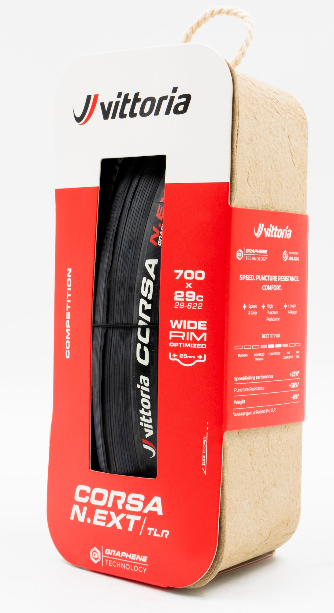 Engineered with the revolutionary, WorldTour-proven technology of Graphene + Silica compounds and the high longevity of a nylon casing. The Corsa provides an impossibly supple connection to the road, erasing rolling resistance, denying road debris, and inspiring confidence through sweeping corners.