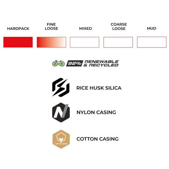 ECO RACE FORMULATION – Next-generation compound blend developed specifically for competitive gravel racing, delivering exceptional speed and grip across varied terrain. Renewable and recycled ingredients include Fair-Rubber certified natural rubber, soybean oil and rice husk ash silica.