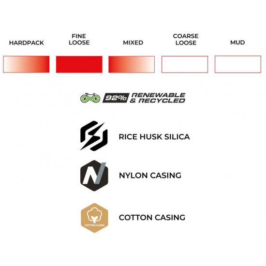 ECO RACE FORMULATION – Next-generation compound blend developed specifically for competitive gravel racing, delivering exceptional speed and grip across varied terrain. Renewable and recycled ingredients include Fair-Rubber certified natural rubber, soybean oil and rice husk ash silica.
