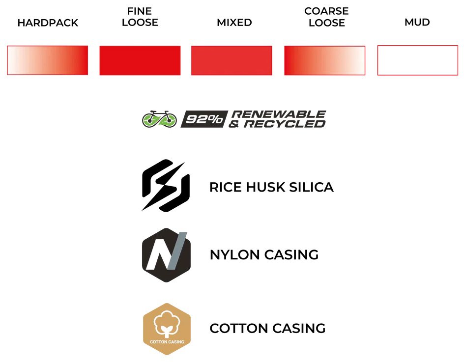 ECO RACE FORMULATION – Next-generation compound blend developed specifically for competitive gravel racing, delivering exceptional speed and grip across varied terrain. Renewable and recycled ingredients include Fair-Rubber certified natural rubber, soybean oil and rice husk ash silica.