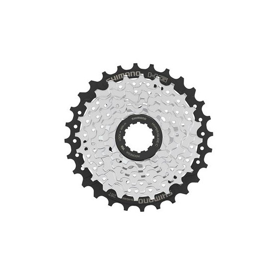 The 7-speed CS-HG400-7 HYPERGLIDE cassette sprocket has a premium-plated design and is compatible with the widely used HG-M spline system. It utilizes SHIMANO's HYPERGLIDE technology to ensure smooth and precise shifting performance.